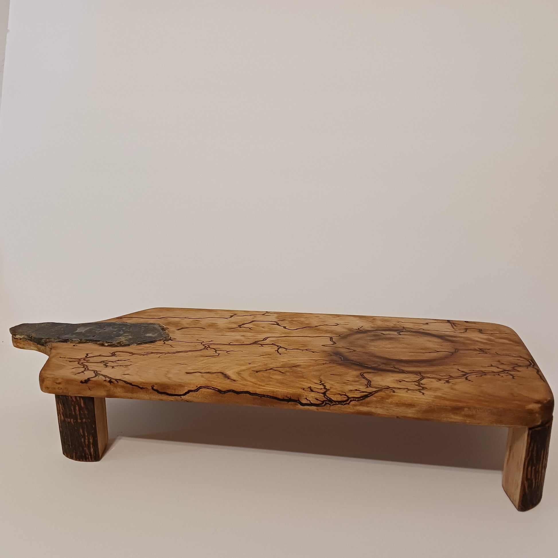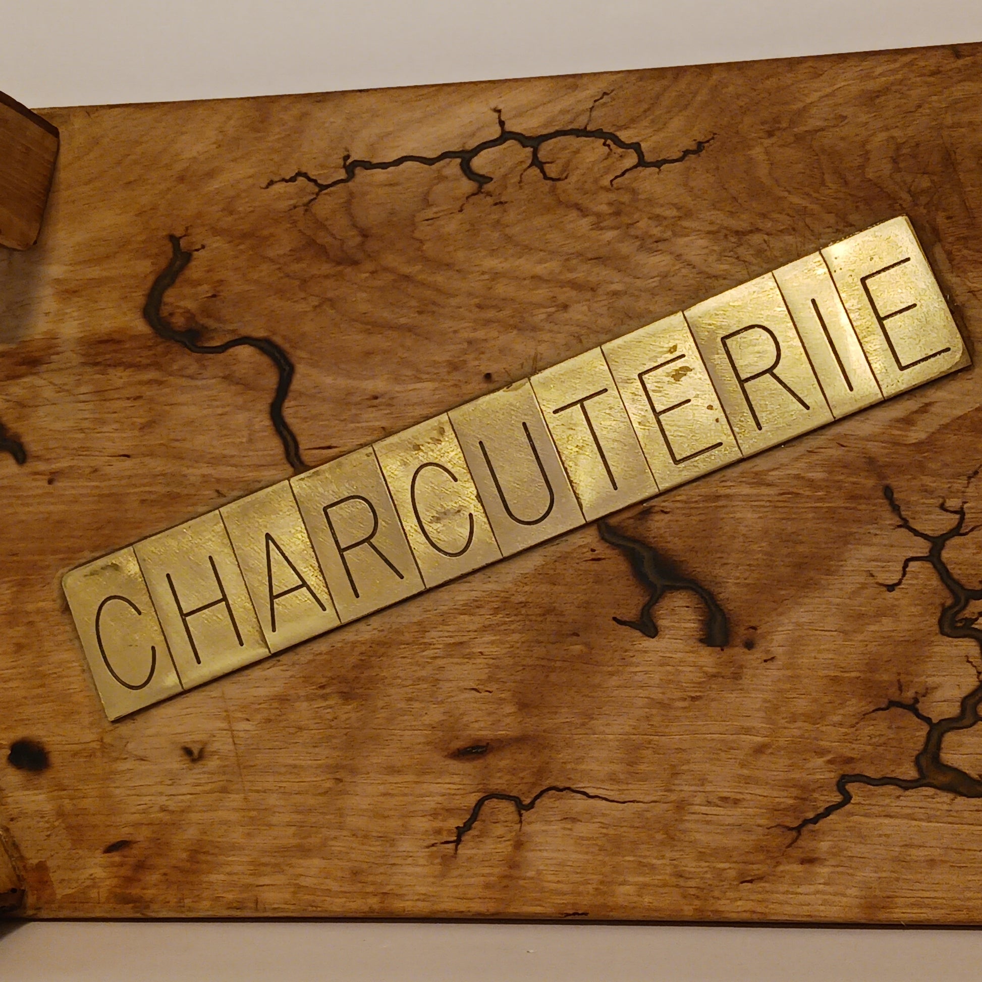 Handcrafted food presentation board. Hickory cutting board converted into a one of a kind work of art. Surface is burnt thru Lynchburg/ Fractal burning technique. Fractures are filled with orange epoxy. Legs are made from self aged hickory limbs. The word Charcuterie is spelled with 1.75" brass letters. Entire board is hand rubbed with Tung oil, Making this beautiful piece food safe.