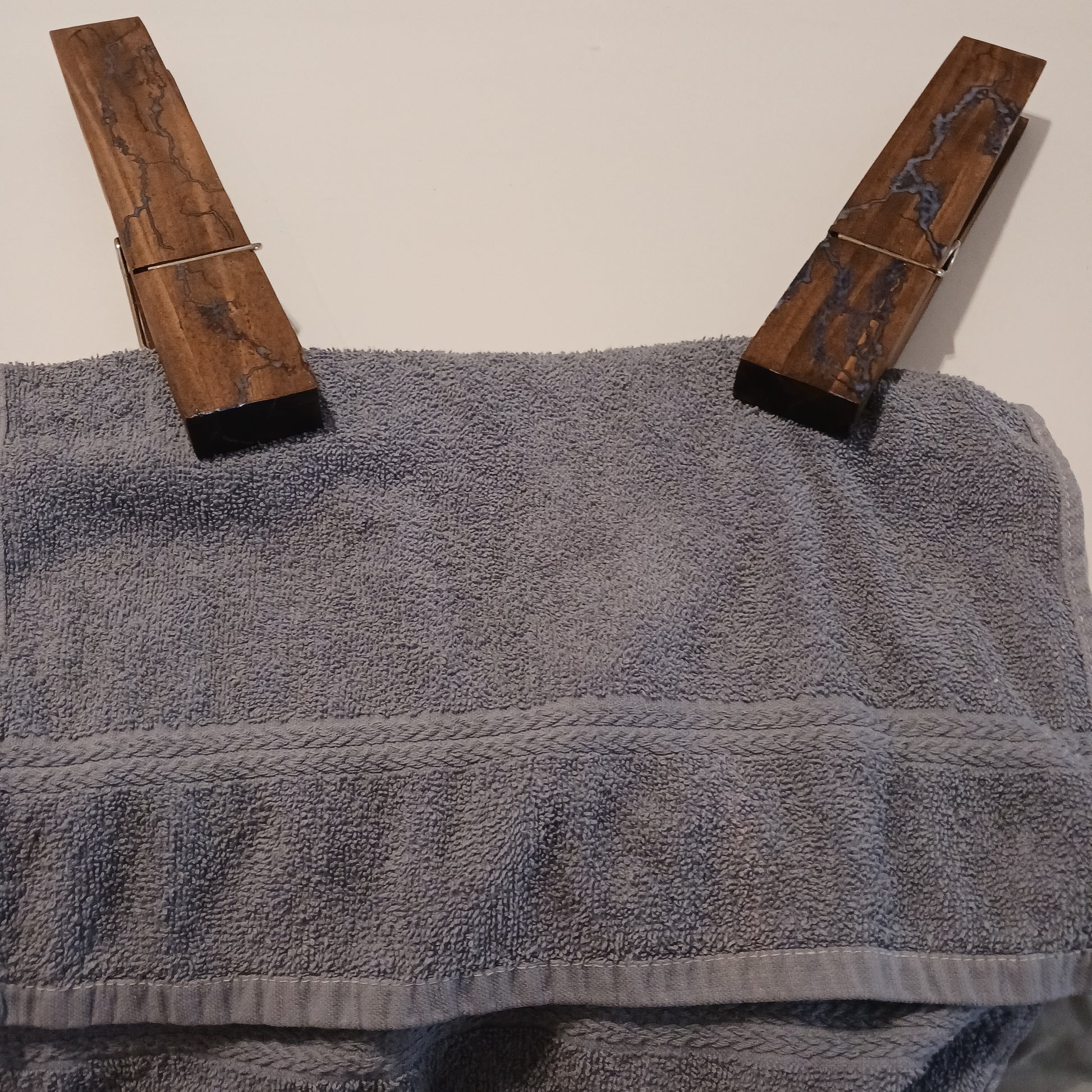1 pair of 11 1/2" wooden clothes pins. stained dark walnut with white epoxy. comes with adhesive strips for hanging on wall.